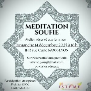 MEDITATION SOUFIE Atelier réservé aux femmes Dimanche 14 décembre 2025 à 16h 11-13 rue Curie 69006 LYON Sur reservation uniquement : isthme.lyon@gmail.com ou via les réseaux Participation en espèces Plein... ...