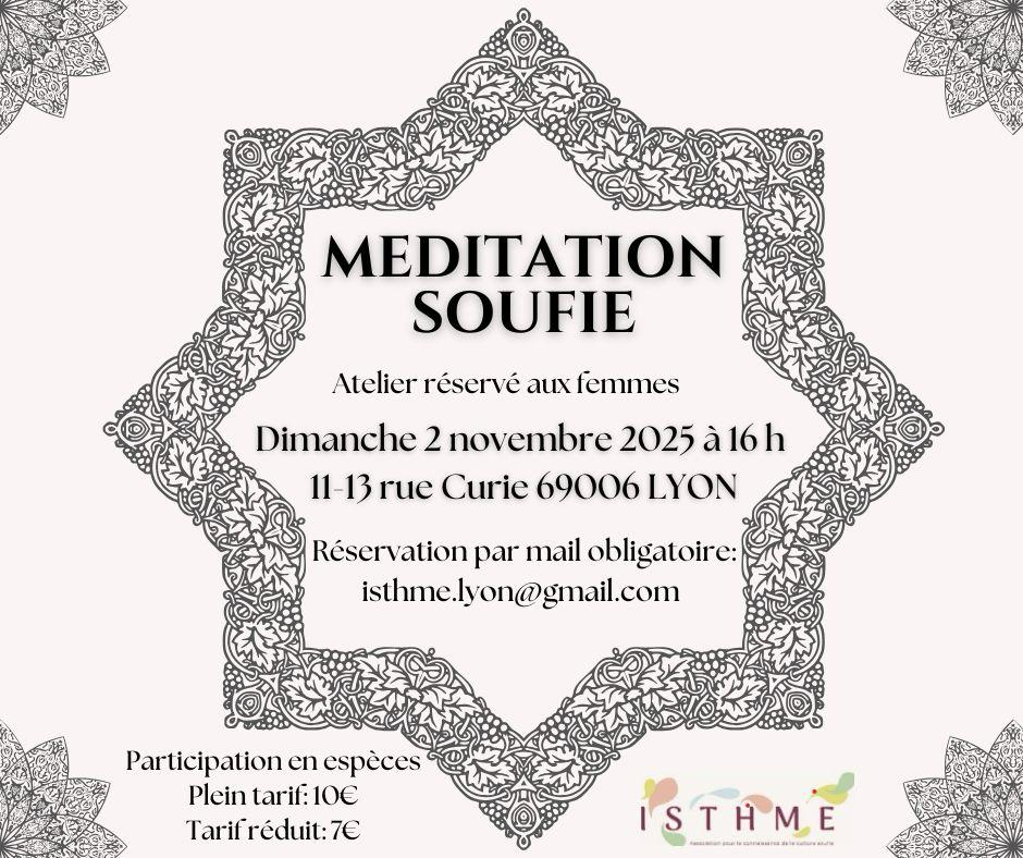 Lyon – Méditation soufie MEDITATION SOUFIE Atelier réservé aux femmes Dimanche 2 novembre 2025 à 16h 11-13 rue Curie 69006 LYON Reservation par mail obligatoire: isthme.lyon@gmail.com Participation en espèces Plein tarif : 10€ Tarif réduit: 7€ + Ajouter à mon Agenda Google + iCal / Outlook export 00 jours 00 heures 00 minutes 00 secondes Date Nov 02 2025 Heure 16h00 - 20h00 Lieu Lyon_curie 11-13 rue Curie 69006 LYON Catégorie Méditations soufies Partagez cet événement