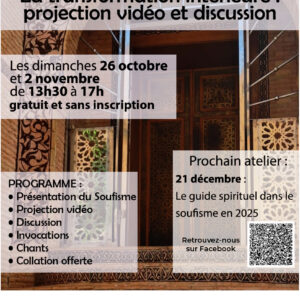 On dit souvent que le soufisme est une saveur et qu’on ne peut le connaître qui si on y a goûté. Ces séances de méditations cherche à vous faire expérimenter... ...