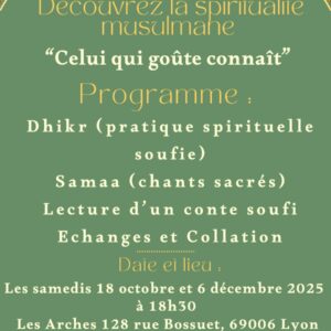 ANGERS – MEDITATION SOUFIE Peut-être avez-vous entendu parler du soufisme ? Peut-être avez-vous croisé les textes inspirants de Rûmî, du Cheikh al-‘Alawî, ou encore de l’Émir Abdelkader ? Le soufisme est une... ...